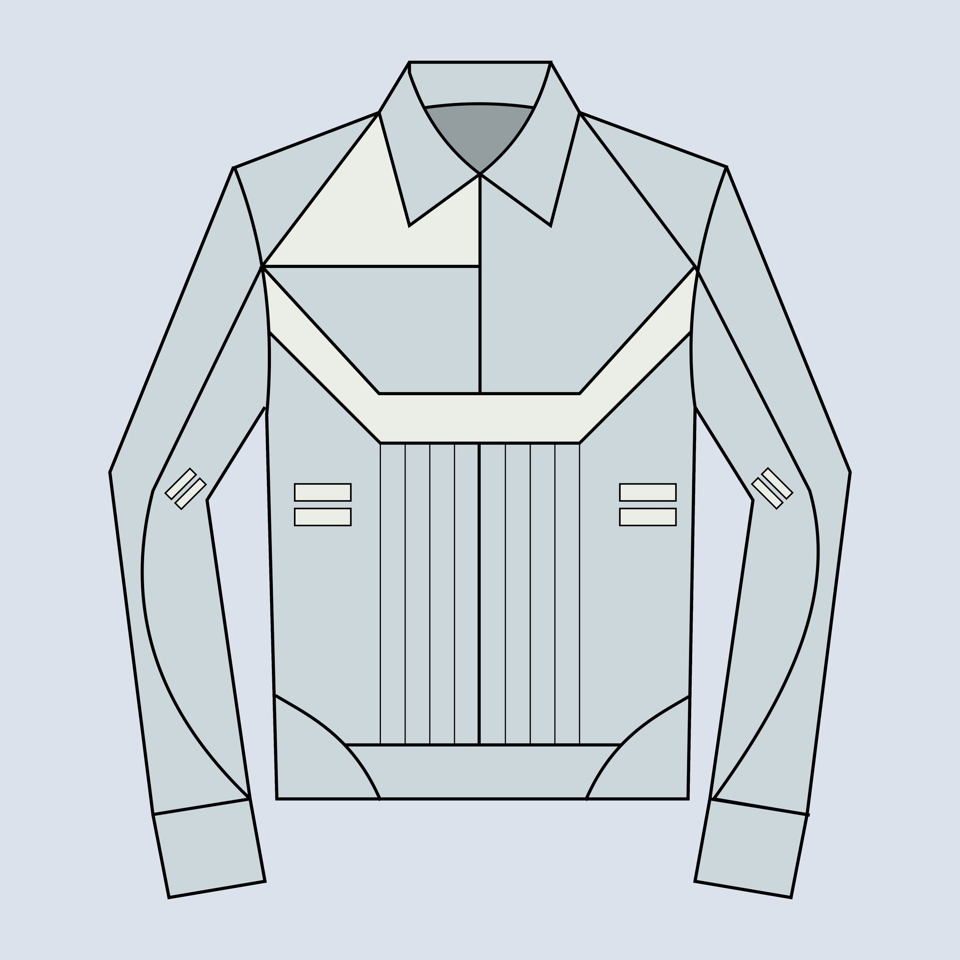 THE SLEEVES TERMINATE IN SHARP BUTTON CUFFS, AND THE BACK PANEL INCLUDES ADJUSTABLE FASTENERS THAT CAN BE TIGHTENED OR LEFT UNDONE TO ALTER VOLUME.