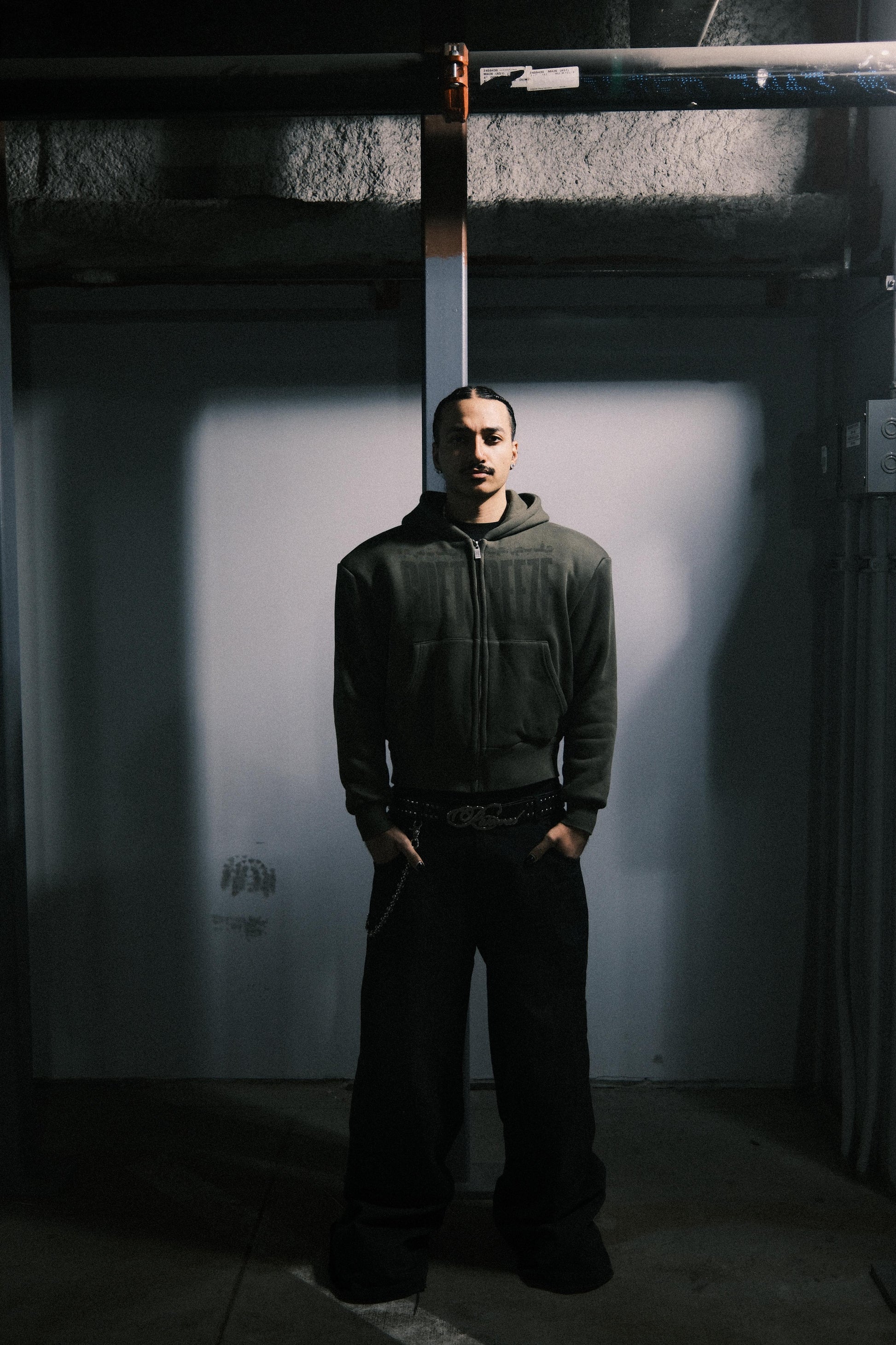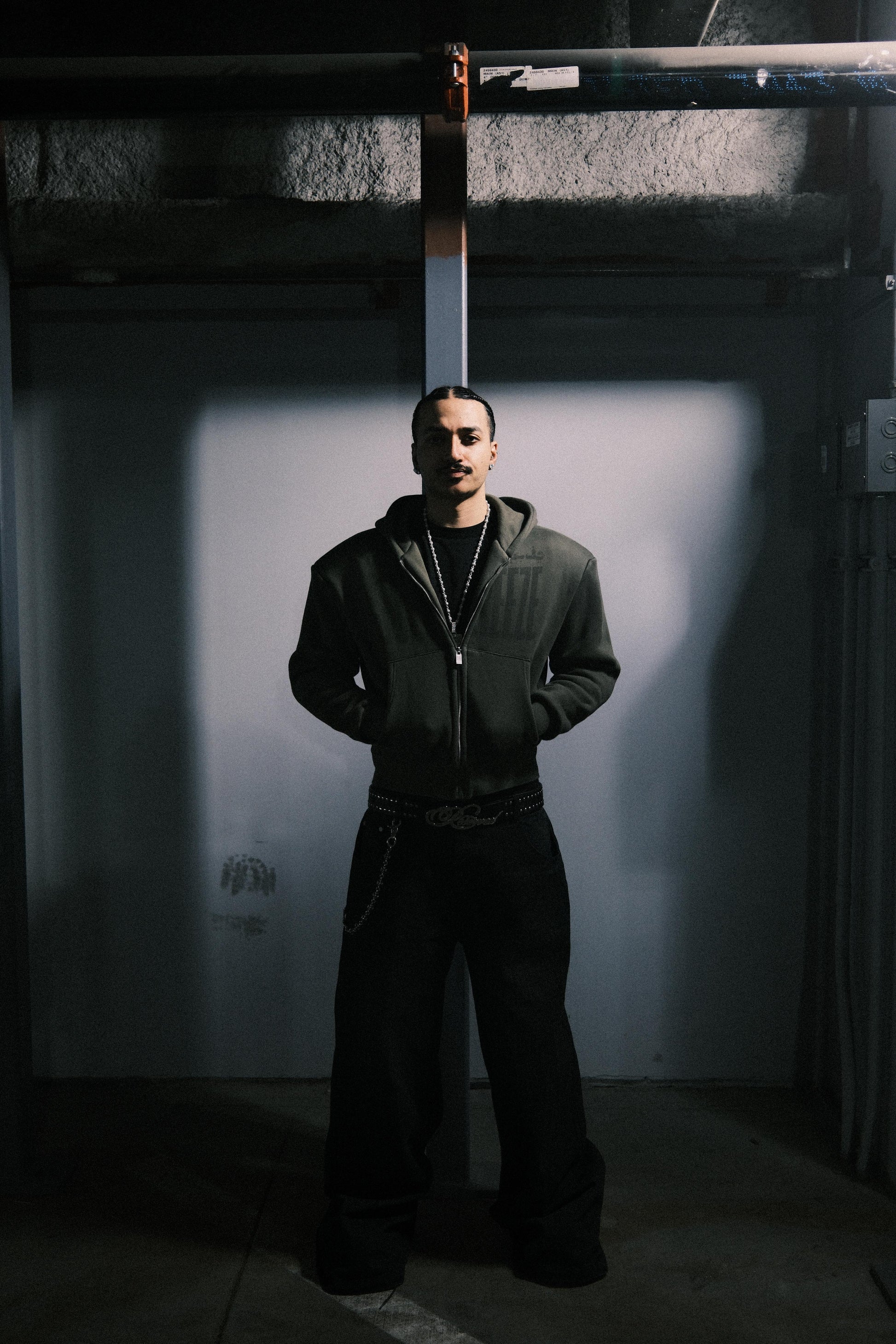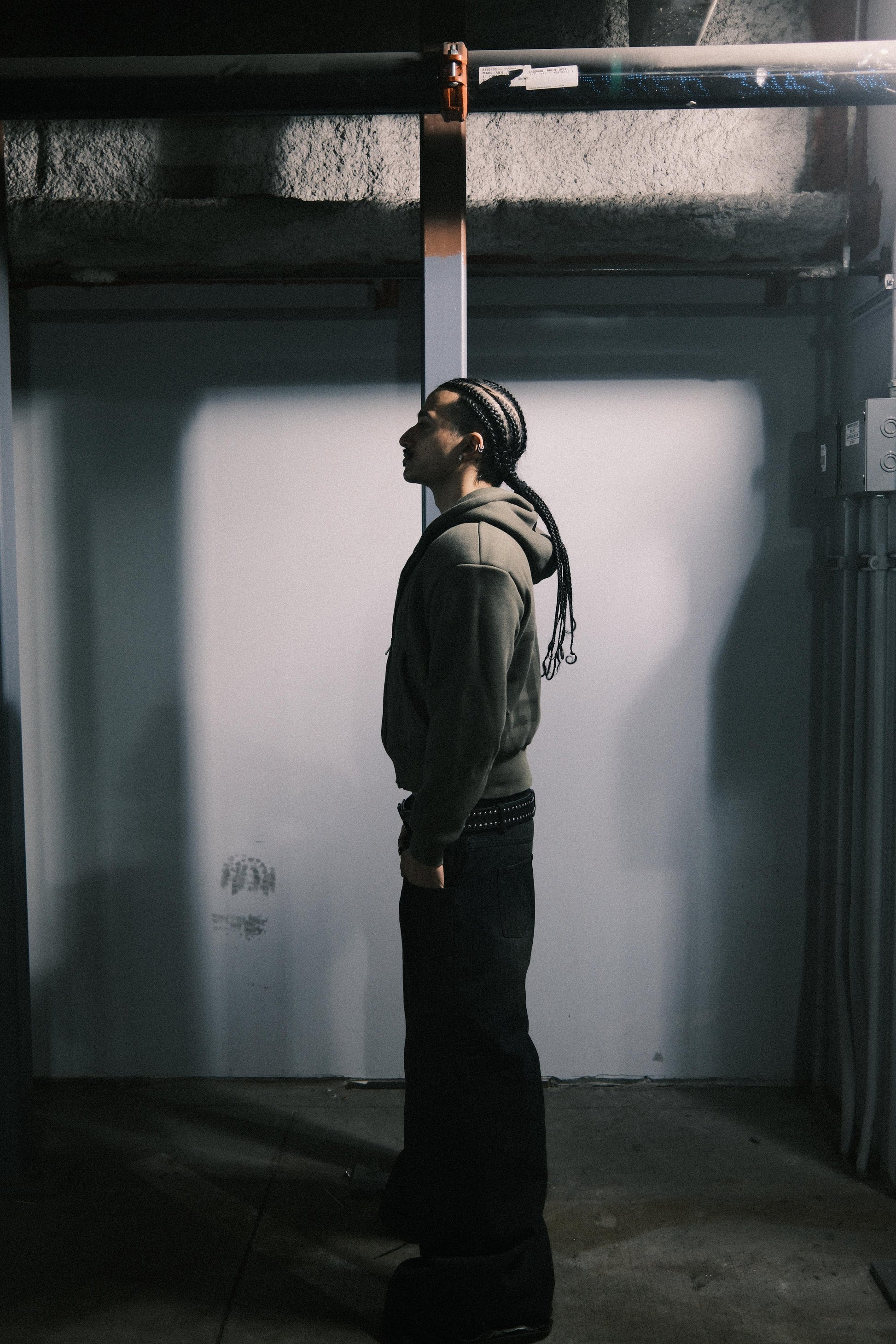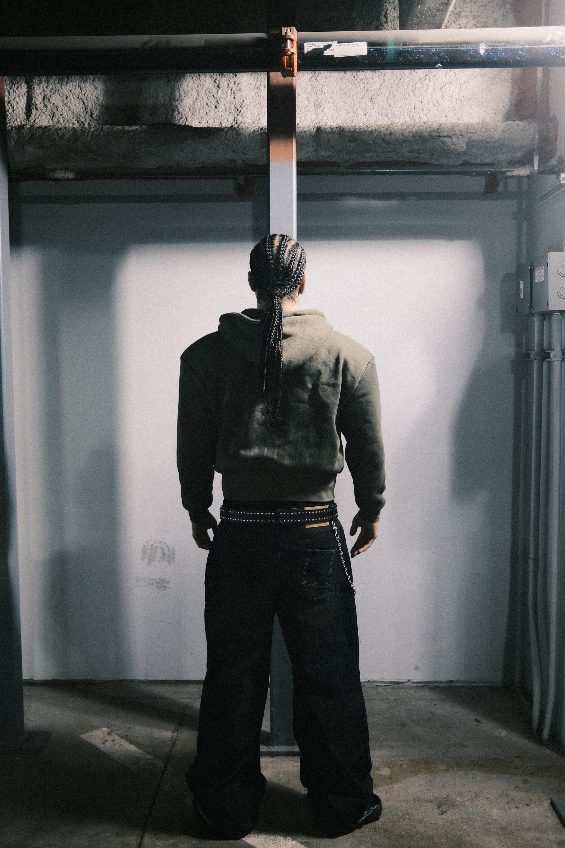 EXTRA-WIDE RIBBING AT CUFFS AND HEM. AN OVERSIZED HOOD SITS FIXED AND MONUMENTAL.
