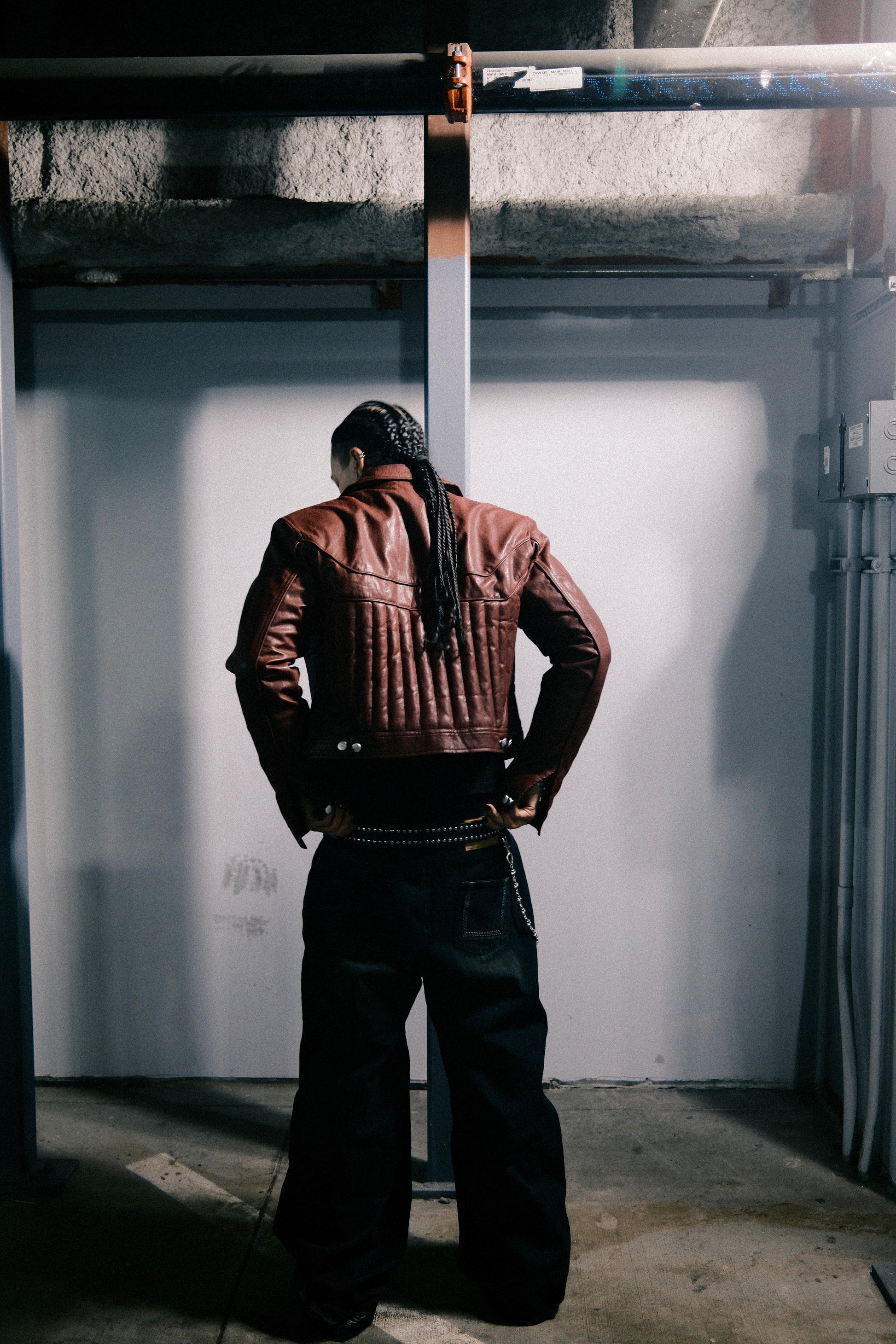 IT FEATURES A TRADITIONAL NOTCHED COLLAR AND EXPOSED DUAL CUSTOM BRUSHED STEEL ZIPPERS AT CENTER FRONT, EACH ENGRAVED WITH A MINIMAL LOGO. THE DUAL-ZIP CONFIGURATION ALLOWS FOR MULTIPLE MODES OF CLOSURE AND STYLING.